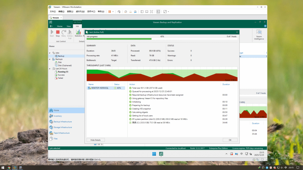 在Windows 10 系统物理机下安装 VMware Workstation,再到VMware Workstation中创建Windows server 2025 虚拟机,并在server 2025中部署VeeamBackup&Replication,Veeam中添加NAS存储作为备份目的地,最后推送备份Agent到安装VMware Workstation 的Windows 10 物理机。然后选择整机备份,就此Veeam把物理机和虚拟机中的它自己在线备份到了NAS。