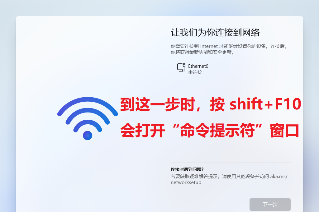 2.在 Windows 11 OOBE 登录账号阶段按 Shift+F10 打开命令提示符(部分笔记本需要按“Shift+Fn+F10”),调出CMD命令提示符窗口