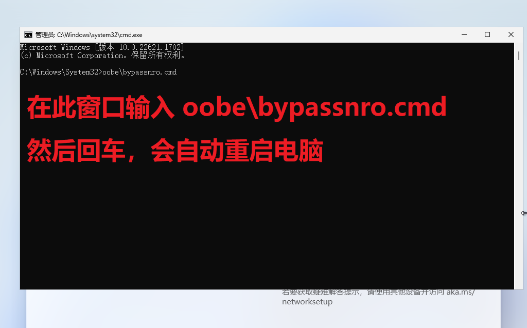 3.在命令提示符窗口中输入 OOBE\BYPASSNRO 按回车键,此时系统会自动重启